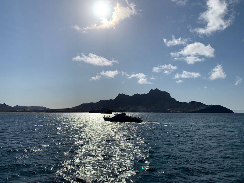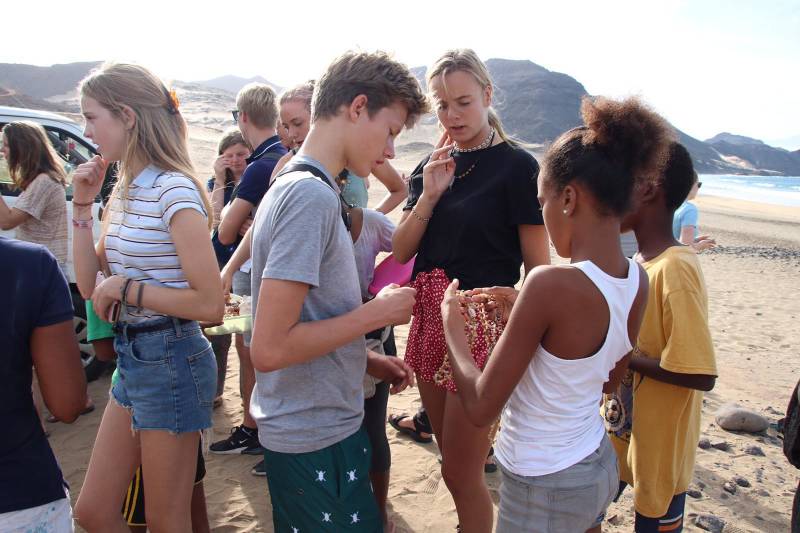 November 28 we arrived in Cape Verde. We saw the islands in the distance for a while and it looked really nice. The landscape was very special. Many mountains and little / almost no forestation. It was all very beautiful until we arrived at the bay where we would lie. All of a sudden it was all industry and cargo ships. We were a bit shocked but luckily we passed a bit and lay in front of a harbor of a super nice city. It was the captain's birthday the next day and then we went to swim in the sea. At the place where we were, that was not allowed because there was a chance of sharks. When we arrived at the beach we immediately ran into the water, only everyone fell right because it became very deep after 1 meter. The water was super beautiful! The next day the group was split in two and half got free time in the morning (I was there), and the other half in the afternoon.